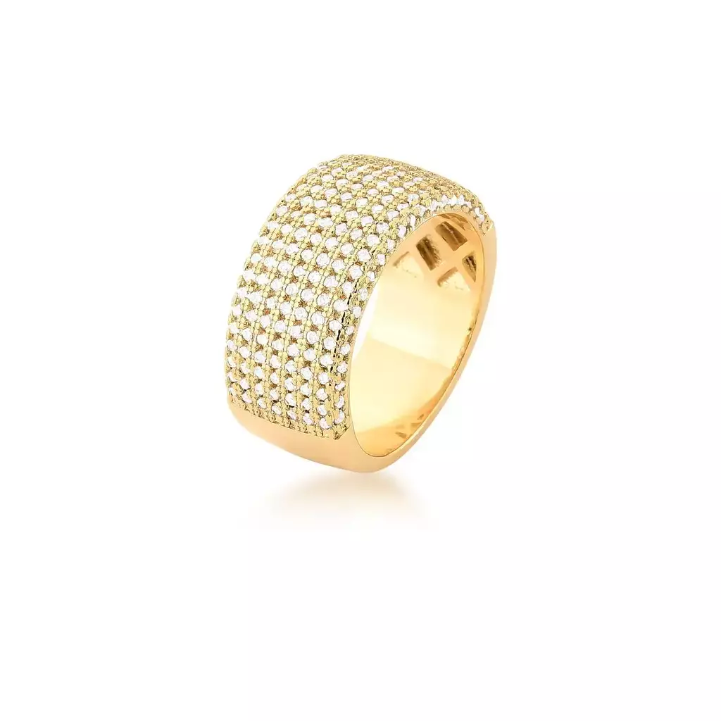 Anel banhado a ouro com nove fileiras cravejadas de zircônias brancas. Com design marcante e acabamento sofisticado, é uma peça que transmite elegância e brilho em cada detalhe. Ideal para compor produções refinadas, o anel é uma excelente escolha para quem busca estilo e presença. Pode ser usado sozinho como destaque ou combinado com outras peças em composições modernas. Produzido com liga metálica de cobre e zinco, recebe banho de ouro e verniz protetor para maior durabilidade. Livre de níquel e com camada antialérgica, oferece conforto e segurança para o uso diário.
