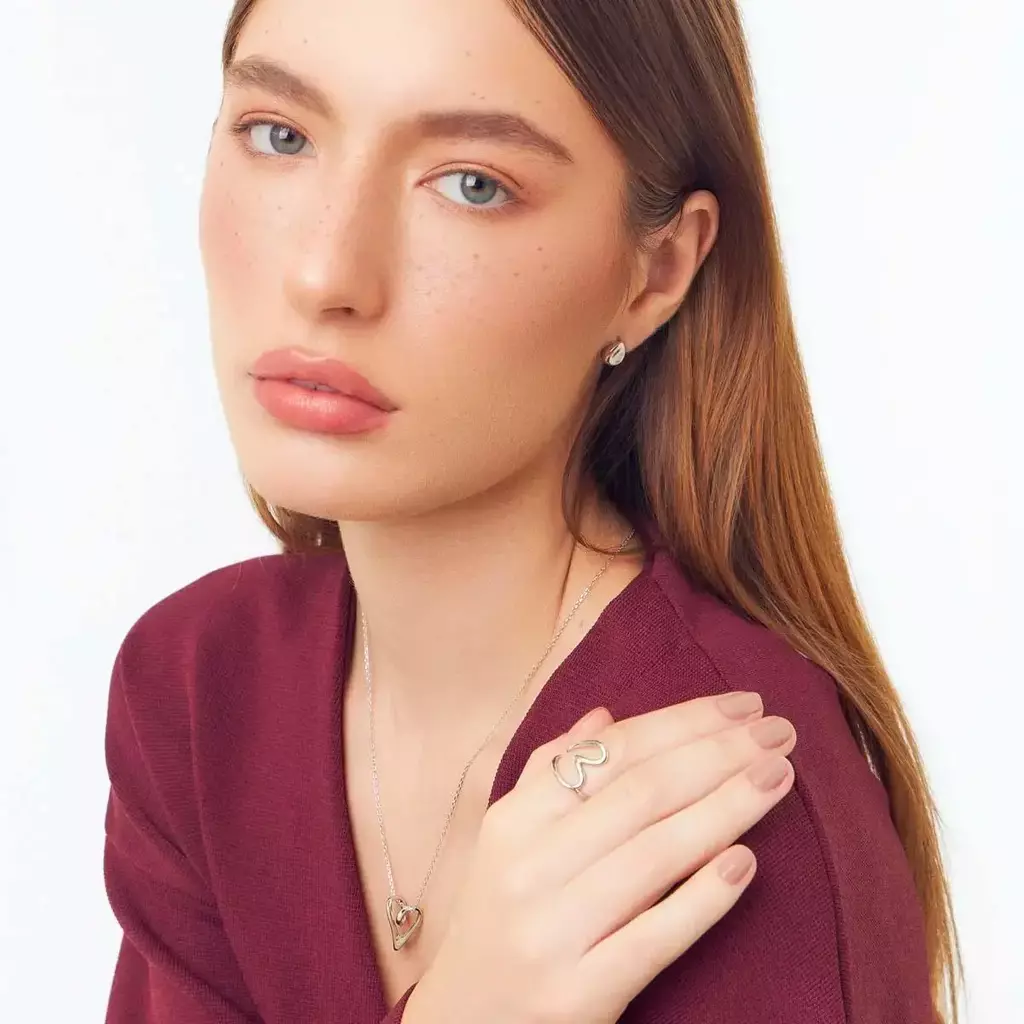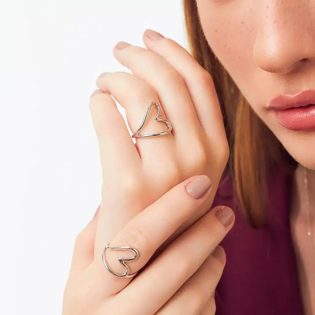O anel de coração vazado em prata 925 com banho de ródio é a escolha ideal para quem busca elegância e delicadeza em um acessório versátil. Seu design curvo e liso transmite sofisticação, tornando-o perfeito para compor looks modernos ou clássicos.