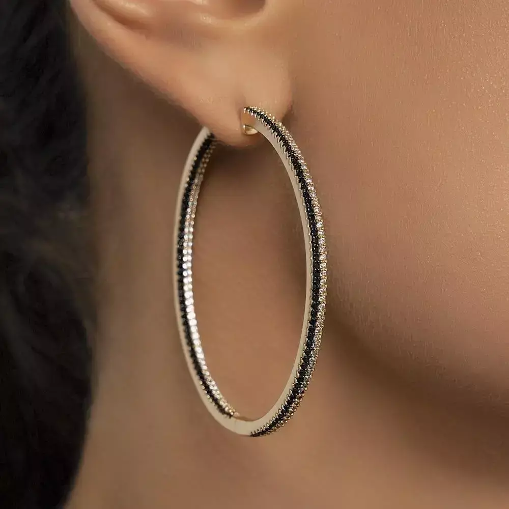 A Argola Duas Fileiras com Zircônias Preto e Branco Banhada a Ouro 18K é uma peça que traduz elegância e ousadia. Seu design imponente combina o brilho das zircônias incolores com a intensidade da zircônia ônix, criando um contraste moderno e sofisticado.