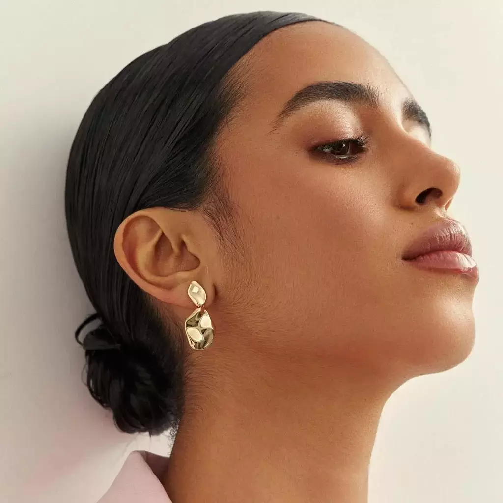 Fabricado com liga metálica de cobre e zinco, o brinco recebe banho de ouro e verniz de proteção, garantindo brilho e durabilidade. Livre de níquel e com camada antialérgica, é ideal para peles sensíveis.