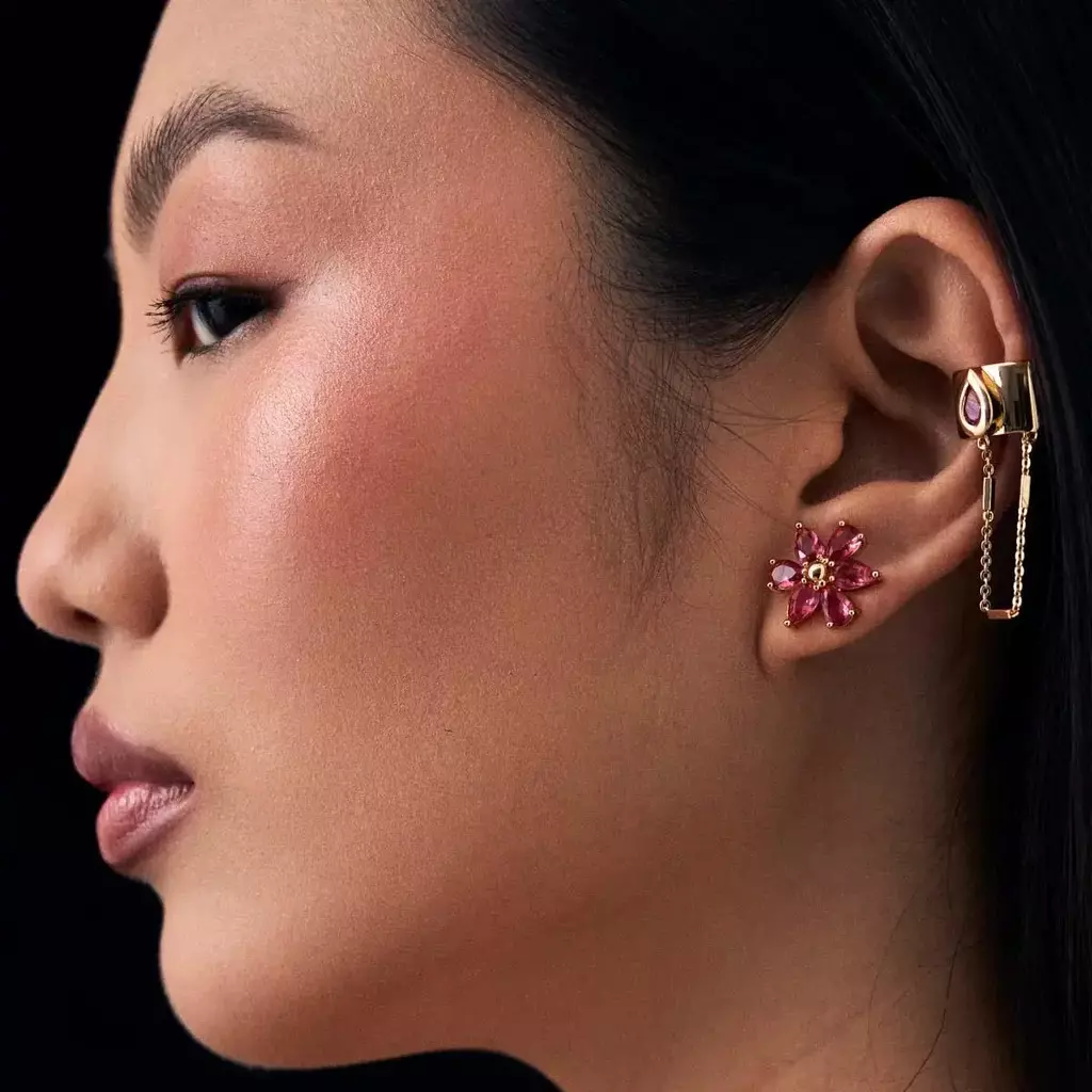 O Brinco Flor com Cristais em Gota Banhado a Ouro 18K é a escolha perfeita para quem busca delicadeza e sofisticação em uma única peça. Seu design em formato de flor, aliado aos cristais rosa escuro, cria um visual elegante e feminino, ideal para compor looks românticos ou sofisticados.