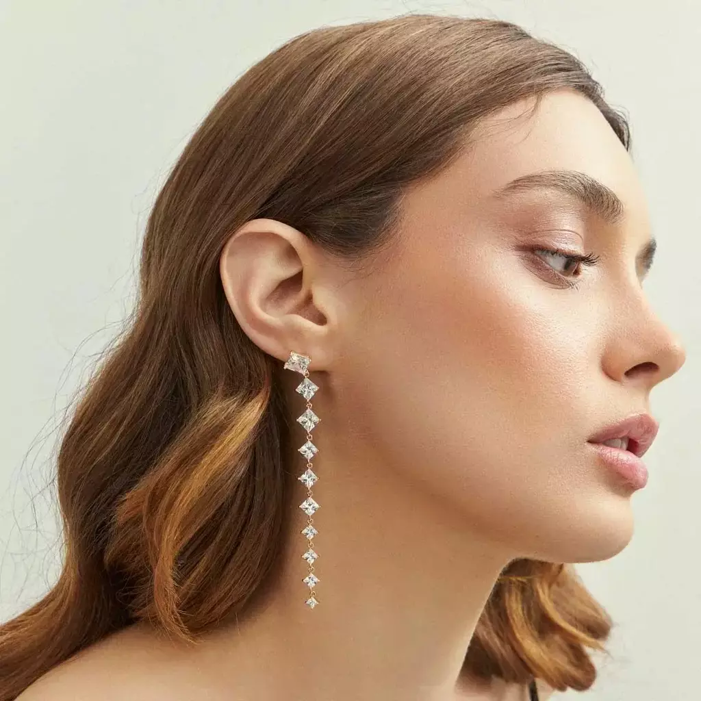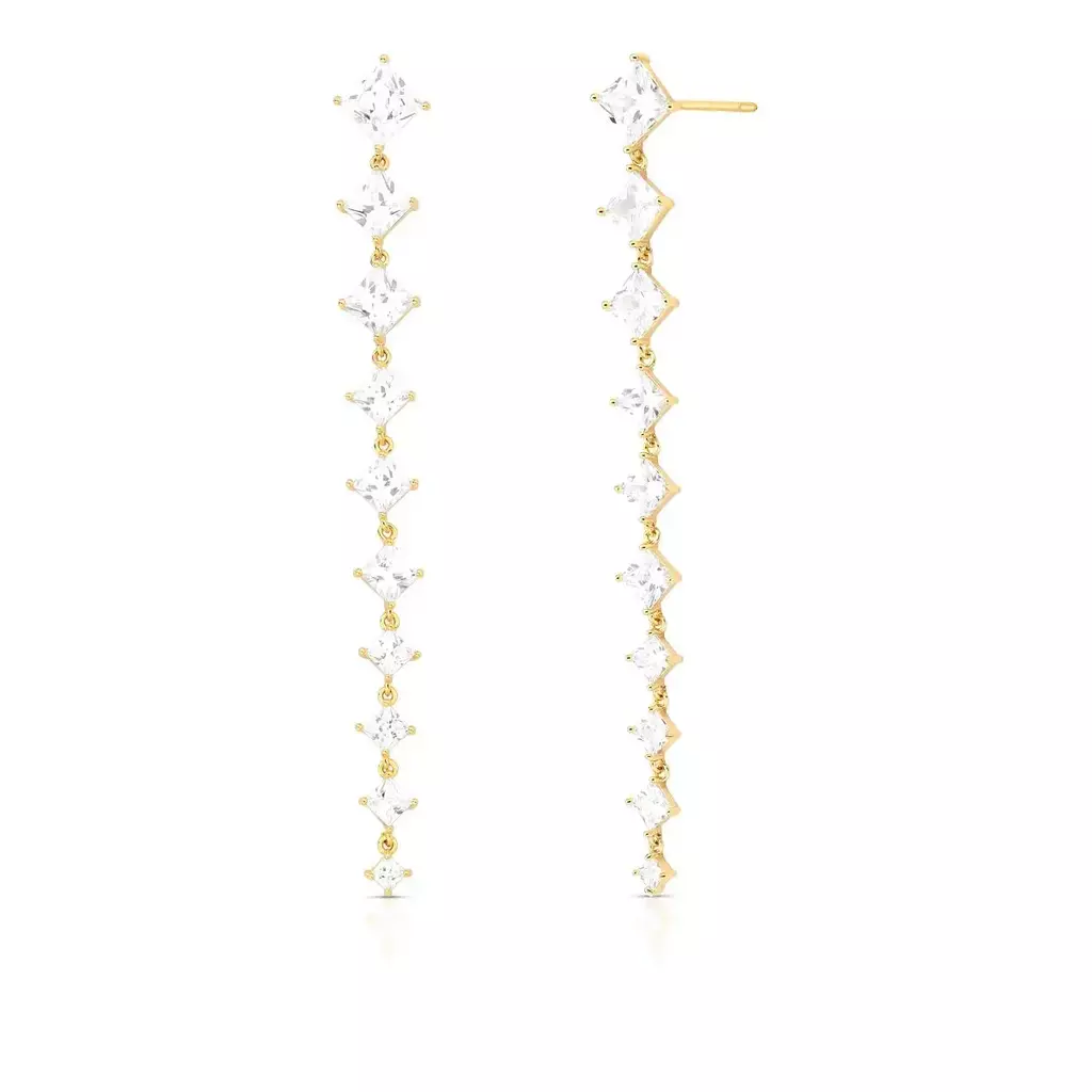 Brinco pêndulo banhado a ouro com cristais em formato de losango e acabamento liso. Com design alongado e elegante, é uma peça que valoriza o rosto com brilho e sofisticação. Os cristais proporcionam um toque refinado, tornando o brinco ideal para compor looks sofisticados em eventos especiais ou para destacar produções no dia a dia. Fabricado com liga metálica de cobre e zinco, recebe banho de ouro e verniz protetor para maior durabilidade. Livre de níquel e com camada antialérgica, oferece conforto e segurança para o uso contínuo.