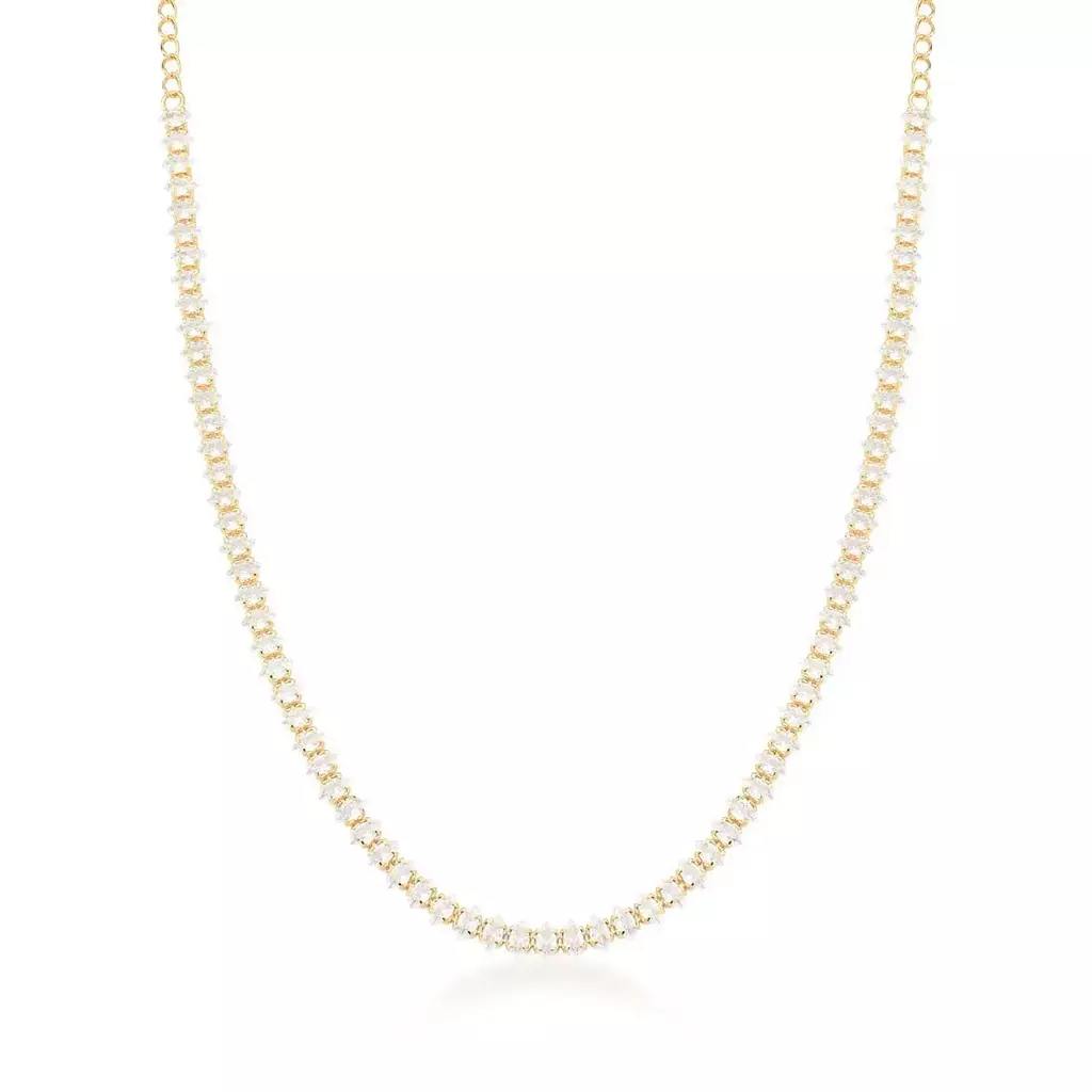As chokers são peças atemporais na alta joalheria e se tornaram indispensáveis no mostruário de quem busca elegância e versatilidade. Esta choker banhada a ouro é marcada por um design delicado e sofisticado, com zircônias em formato navete que proporcionam brilho intenso e refinamento ao visual.
