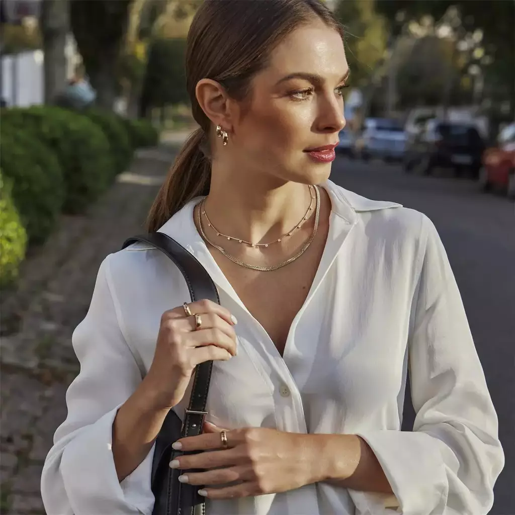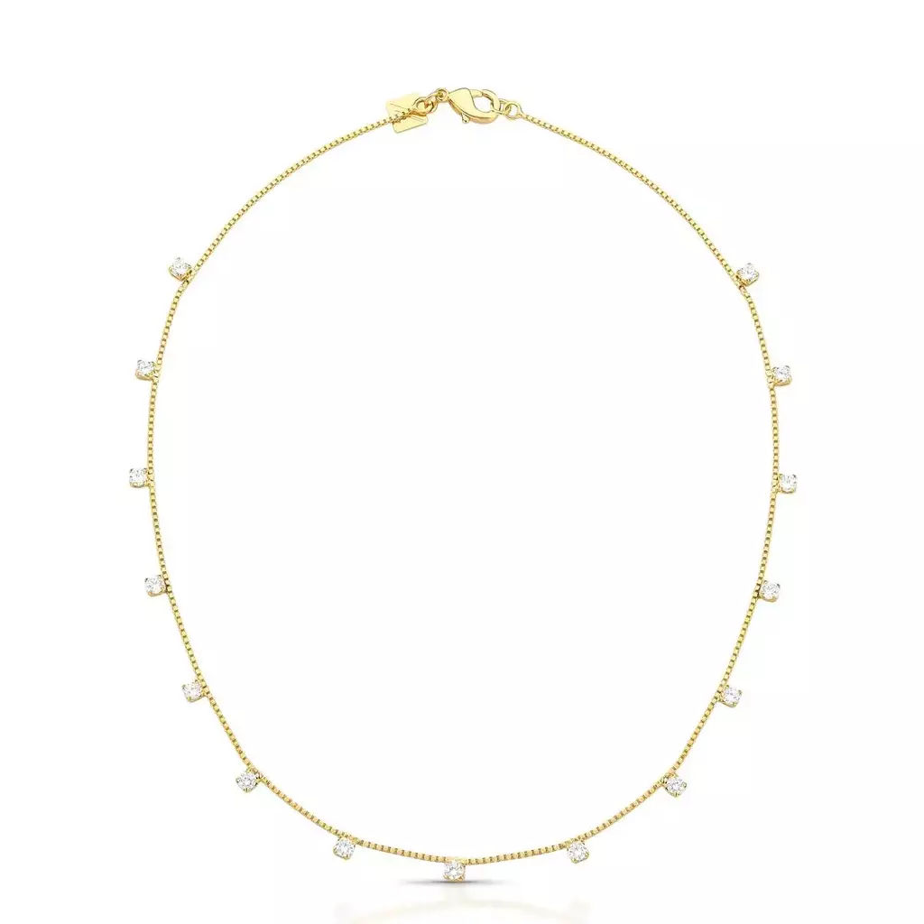 Colar delicado e minimalista com cristais redondos transparentes distribuídos ao longo de uma corrente fina banhada a ouro. Cada cristal é fixado por uma base dourada, criando um visual leve e sofisticado. O fecho tipo lagosta garante segurança e praticidade no uso. Ideal para compor looks elegantes e versáteis, o colar é perfeito para uso diário ou ocasiões especiais. Fabricado com liga metálica de cobre e zinco, recebe banho de ouro e verniz protetor para maior durabilidade. Livre de níquel e com camada antialérgica, proporciona conforto e segurança para todos os estilos.
