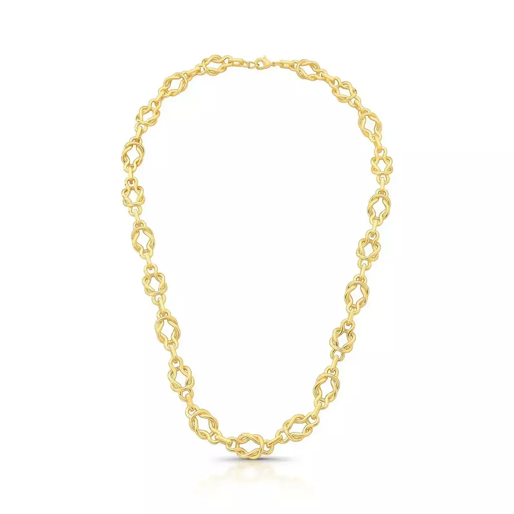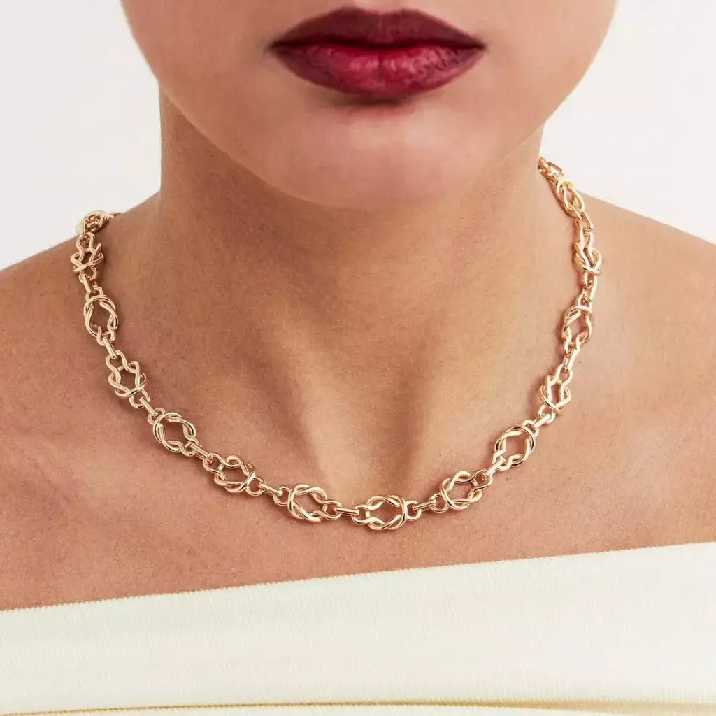 O Colar com Elos Intercalados e Trançados Banhado a Ouro é uma peça marcante que une sofisticação e modernidade em um design exclusivo. Com elos curvos, trançados e vazados, esse colar oferece um visual elegante e versátil, ideal para compor desde produções casuais até looks mais refinados.