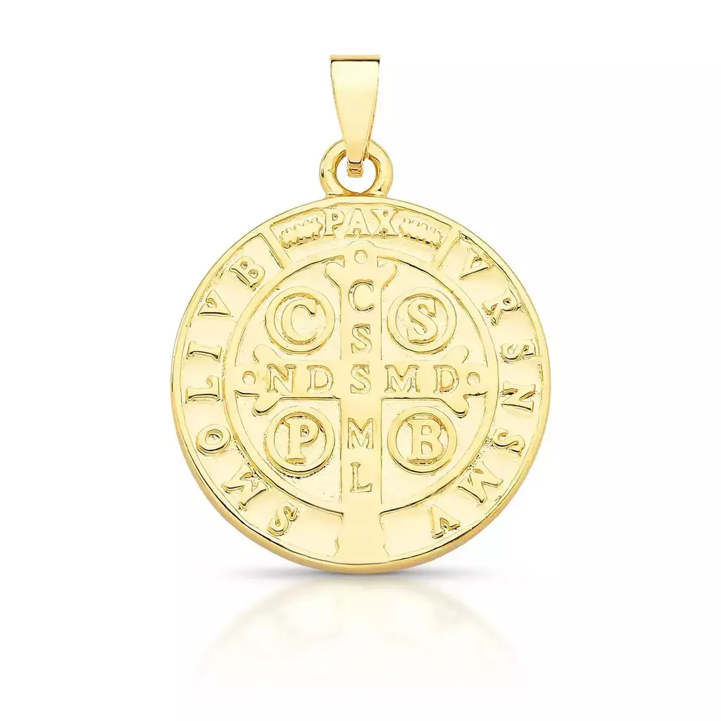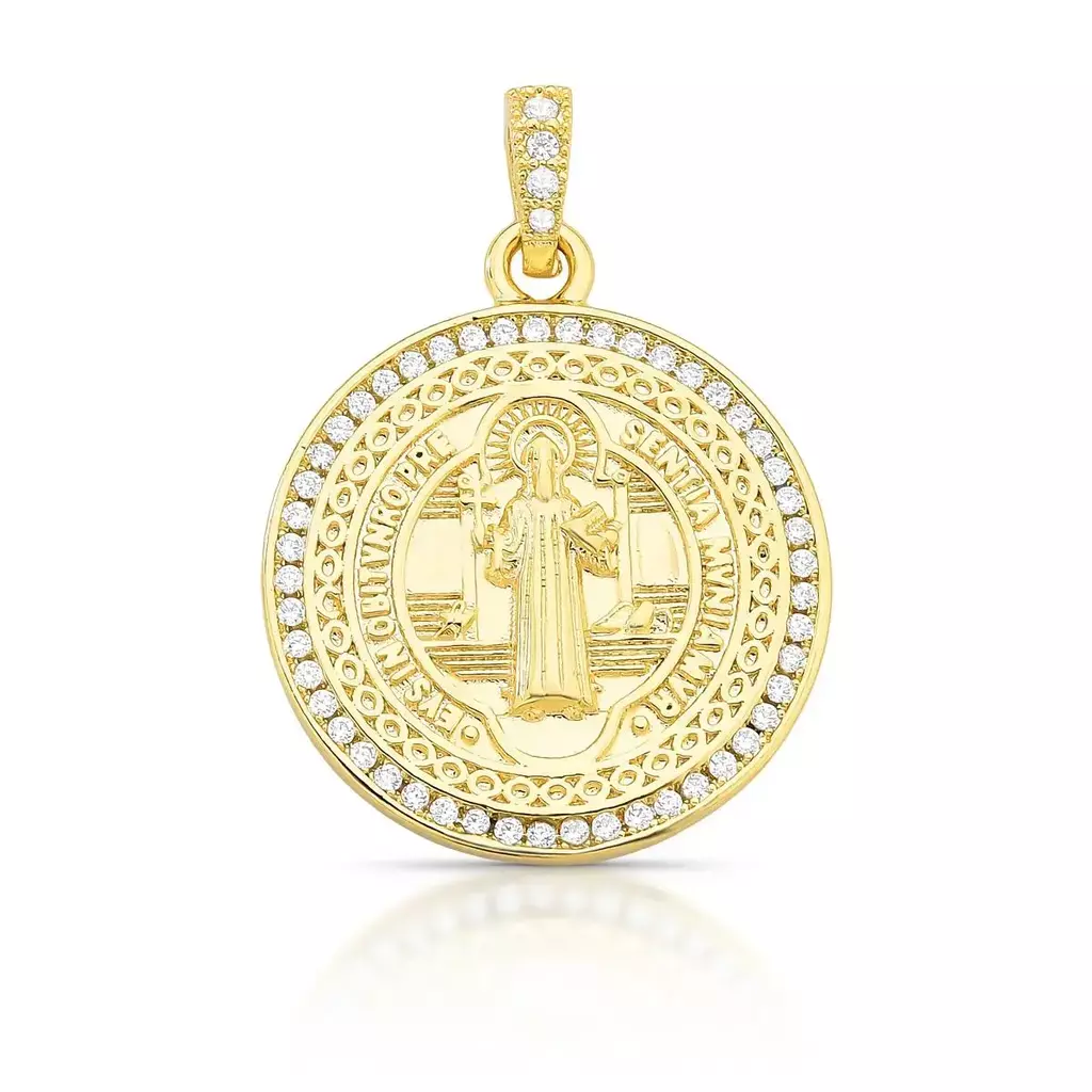 Pingente redondo em formato de medalha com imagem de São Bento, cravejado com zircônias e banhado a ouro. Uma peça que une fé, estilo e sofisticação, ideal para compor colares com personalidade e elegância. Seu acabamento liso e brilho das pedras proporcionam um visual moderno, combinando com diferentes looks e ocasiões. Produzido com liga metálica de cobre e zinco, recebe banho de ouro e verniz protetor para maior durabilidade. Livre de níquel e com camada antialérgica, é seguro e confortável para o uso diário.
