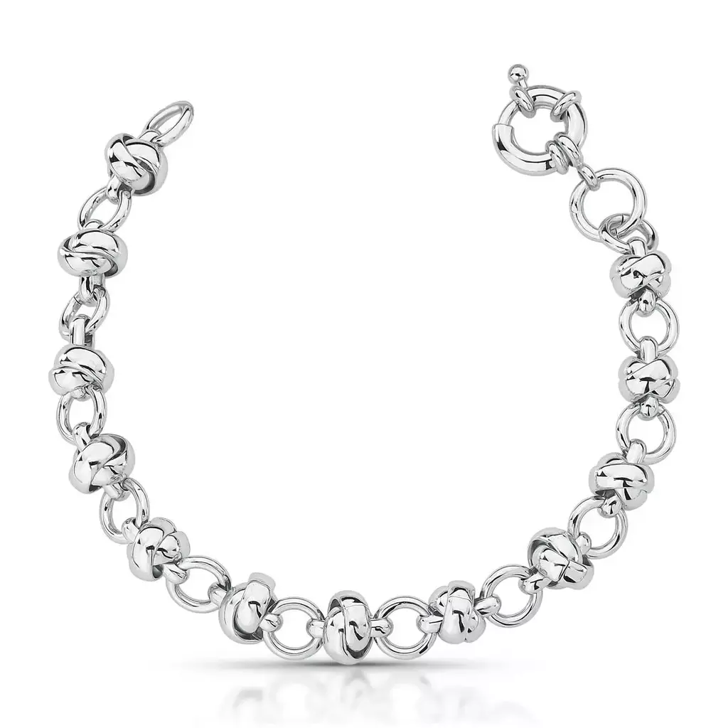 Pulseira com elos trançados e intercalados em formato de nós, com acabamento polido e fecho tipo mola redonda. Seu design clássico e elegante valoriza o brilho do banho de ródio, tornando a peça ideal para compor produções sofisticadas e versáteis. Pode ser usada sozinha ou combinada com outras pulseiras para um visual mais marcante. Fabricada com liga metálica de cobre e zinco, recebe banho de ródio e verniz protetor para maior durabilidade. Livre de níquel e com camada antialérgica, proporciona conforto e segurança para o uso diário.